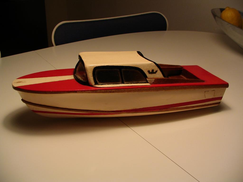 Hejsa Michael, også dette kan jeg svare dig på. Den model du har fundet er en hjemmegjort kopi af en Coronetmodel man kunne købe som byggesæt omkring årene 1956-og til ?. Da jeg var dreng investerede jeg af og til nogle af pengene jeg havde tjent som avisdreng og bybud, i træbyggesæt af forskellige skibe man kunne købe i hobby og legetøjsforretninger. Vi var flere drenge der havde samme interesse så vi satte elmotorer i bådene og sejlede med dem hvor det var muligt. Originalmodellen af den båd du har fundet var et af de byggesæt jeg selv købte og samlede. Det var limet sammen af tynde træplader 2-2,5 mm tykke over nogle få spanter der faktisk var placeret hvor originalbådens skotter var anbragt. Modellen var en meget fin og nøjagtig lille kopi af en Coronet 16 Convertible med påhængsmotor. Den havde en plastic hardtop og frontvindue i klart plast, akkurat mage til den rigtige båds. Den var ca. 40-45 cm lang og der kunne købes fitting der passede til den. Der kunne også købes en batteridrevet påhængsmotor til at montere på modellen når man ville sejle med den. Man fandt et sted med soppedybt vand, f.eks et gadekær eller et andet større bassin og sejlede til hinanden med modellerne. Der var jo ikke noget der hed fjernstyring og man skulle jo helst kunne få fat i sin båd hvis den standsede ude midt i vandet. Modellen havde jeg indtil for 10-15 år siden hvor den blev en del af et flyttelæs og jeg har faktisk aldrig siden set den. Så vidt jeg ved har der ikke været lavet andre Coronetmodeller som byggesæt til salg i forretninger. Mvh Finn 1786.