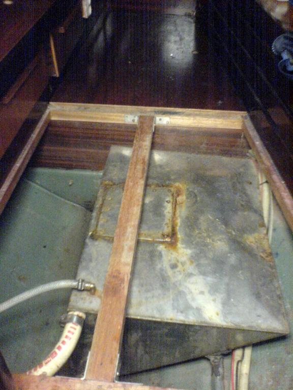 I min Oceanfarer är septiktanken placerad under durken utanför toaletten fast på andra sidan det långskeppsgående skottet. Alltså mot garderoben. En figursågad, rostfri tank på ca 45L.
