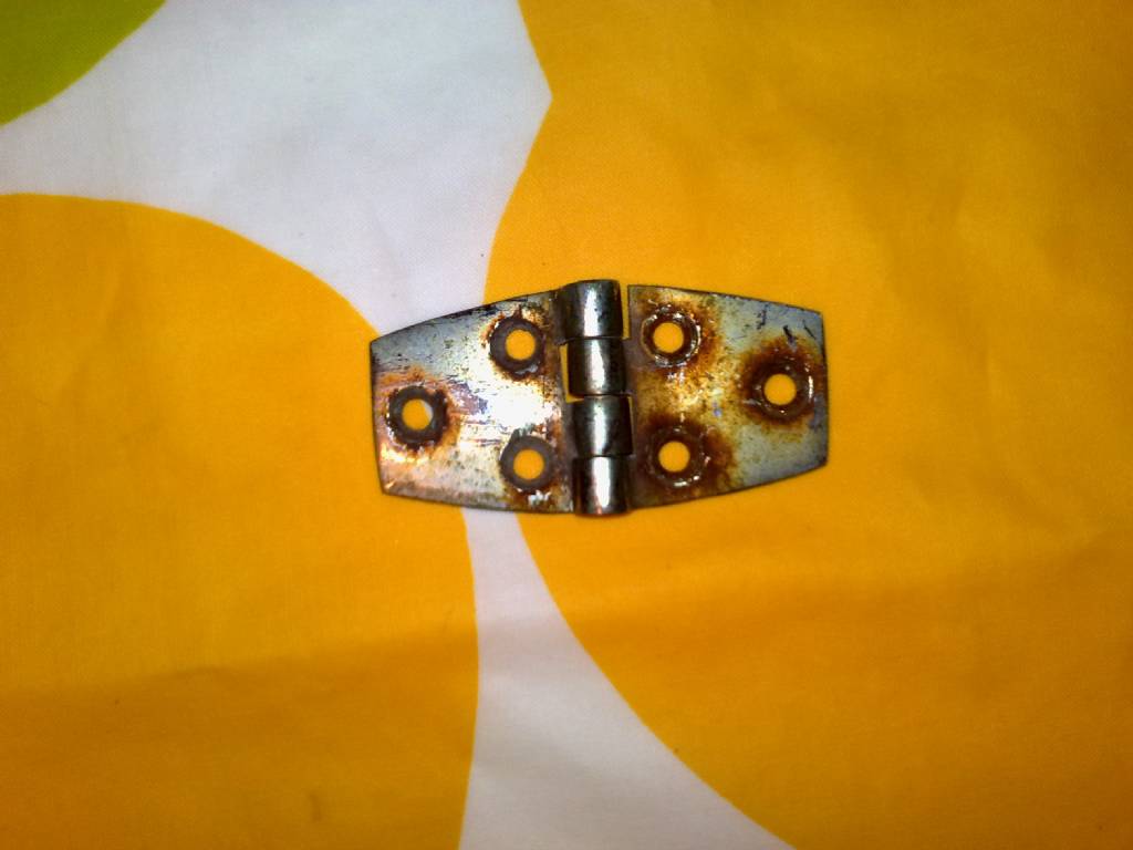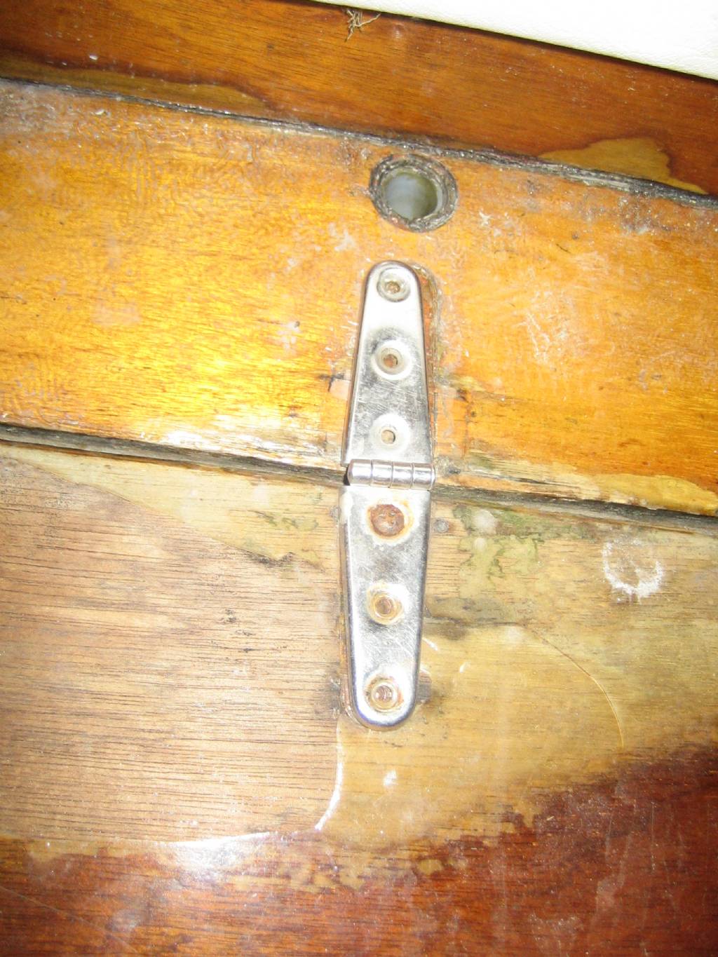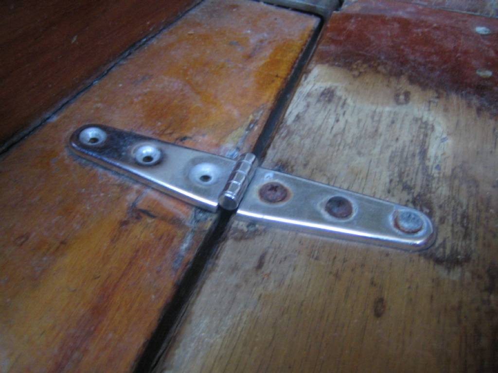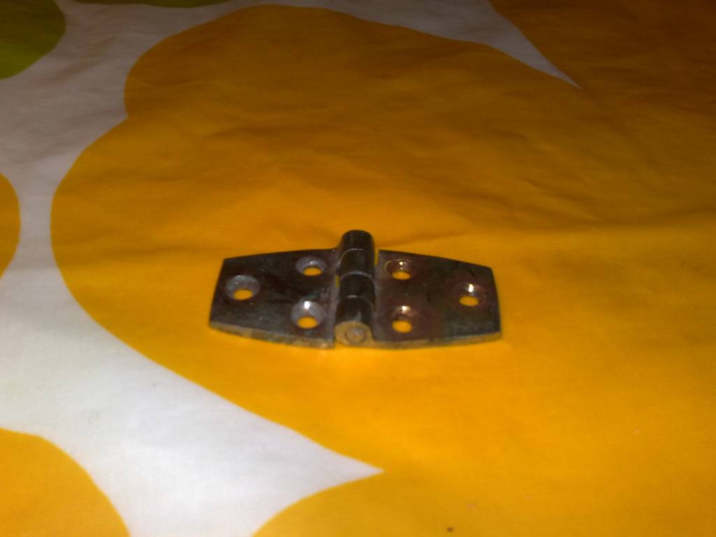 Så här ser mina gångjärn ut. Osäker på om dom är orginal men mycket troligt med tanke på skicket på resten av luckan. Min båt är årsmodell 1977.